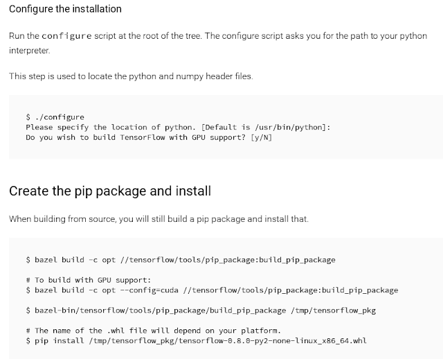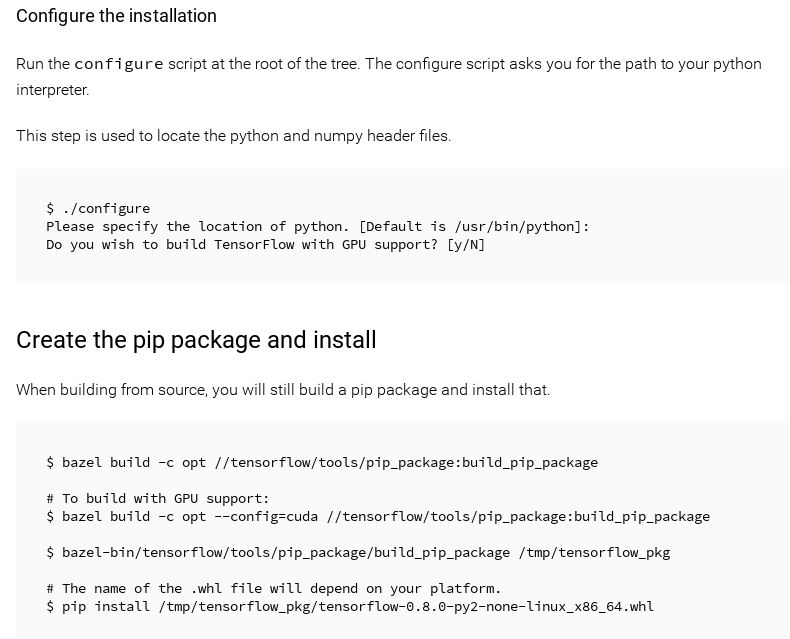 Then you just follow the standard process they detail on their page. For location of Python, you MUST use Python 2. I've tried Python 3 and it doesn't work for whatever reason. Because I was trying a lot of different things at once, it could definitely work for you. Do not run the instruction for GPU support. The name of the output package in /tmp/tensorflow_pkg/ will be different than what's in the picture.